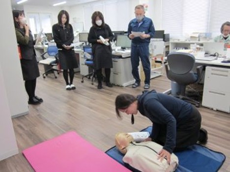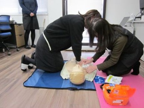 社内にAEDを設置しましたので、訓練用のマネキンとAEDを使って心肺蘇生とAEDの使用方法を学びました。